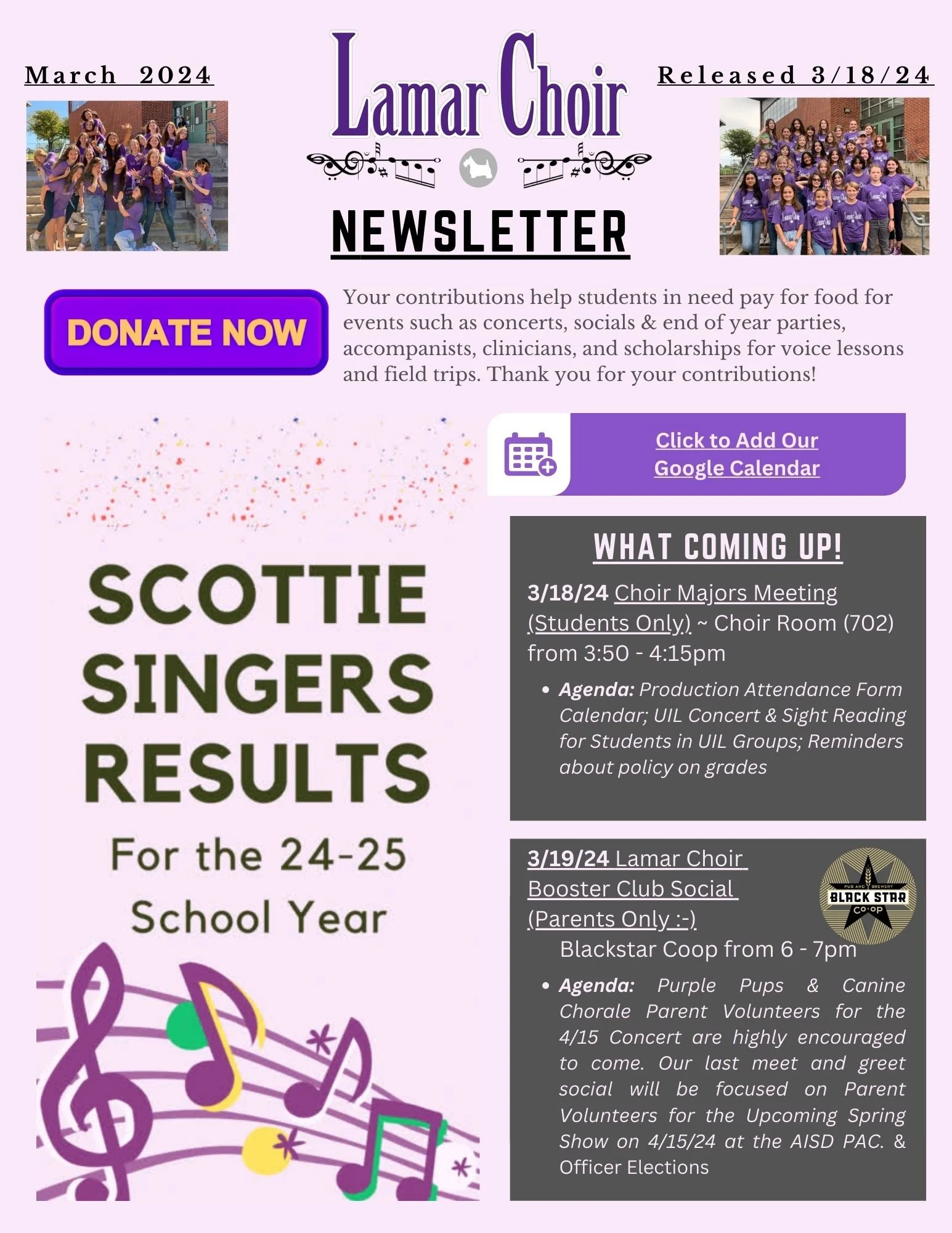 Just announced for the 2024-2025 school year, Varsity Treble Choir, Scottie Singers, is traveling to Disneyworld next year!